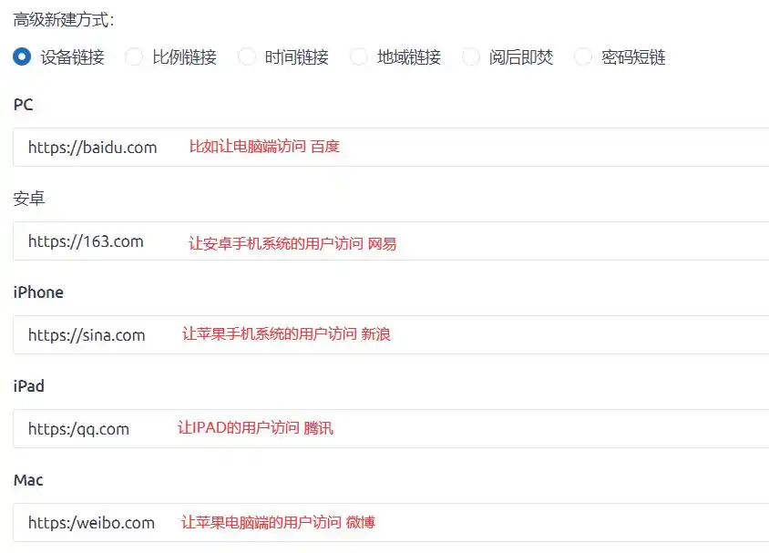 例如小月短链接平台有高级的功能,可以生成按设备访问不同链接、按地域访问不同链接、按时间段访问不同链接、按访问比例分配给不同的链接、支持短链接加密访问、支持短链接阅后即焚、支持自定义短链接后缀等, 同时提供详细的短链接的访问分析,可以识别用户的设备访问,浏览器访问等,上述的这些功能,我们可以结合在短信营销中,拿一个按地域访问不同的链接来说,假如你是做电商的,同一个短信链接,你可以针对你的产品受众区域名让不同区域的客户访问你不同的产品详情页,做到一条内容一条链接客户精准覆盖的功能,又拿时间段访问不同链接的功能来说,可以根椐你的客户在不同时间段的活跃度精准推广,让活跃时间段的客户访问A链接,让另一活跃时间段的客户访问B链接。
