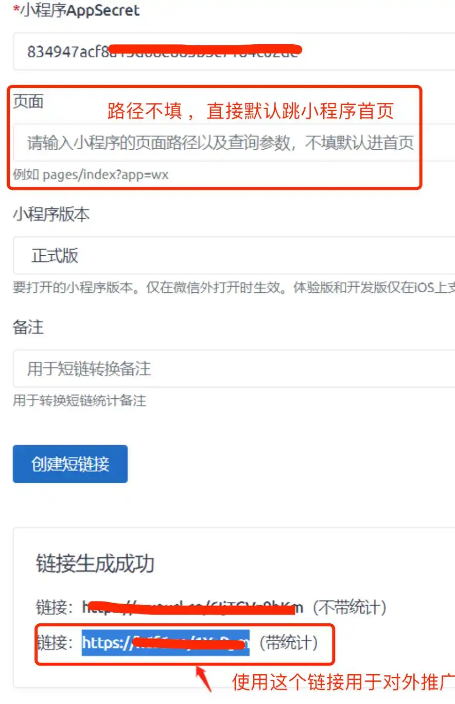 第二步:获取小程序的三个参数,小程序的APPID 、小程序APPSecret、以及你要跳转小程序某个页面的页面路径(具体获取的方法下面会讲),填好这些参数后,直接点创建短链接,创建后注意一定要使用带统计的链接用来推广,可以全方面跟踪小程序链接的推广效果。