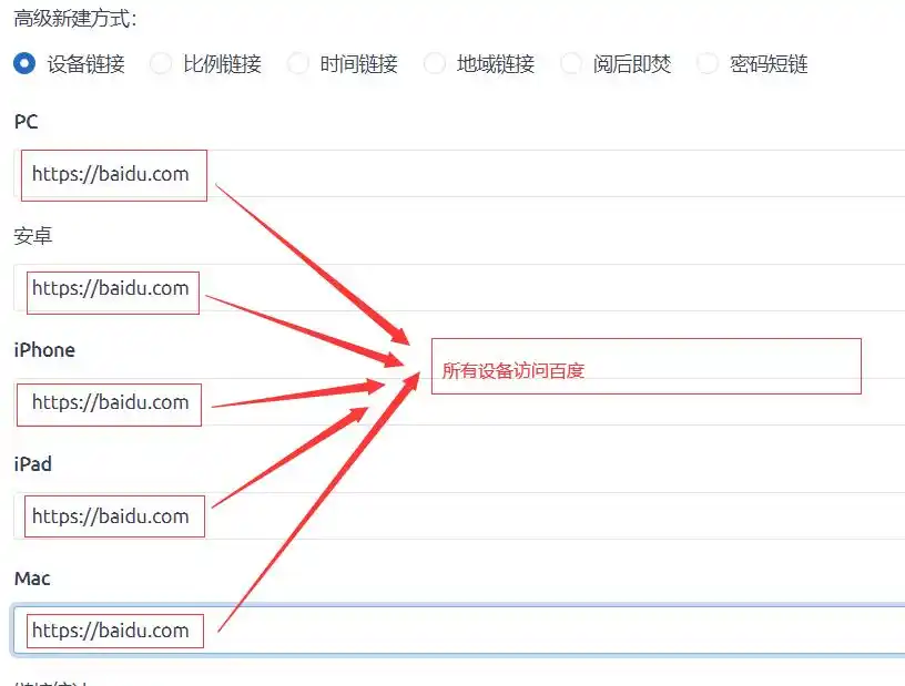 例如小月短链接平台有高级的功能,可以生成按设备访问不同链接、按地域访问不同链接、按时间段访问不同链接、按访问比例分配给不同的链接、支持短链接加密访问、支持短链接阅后即焚、支持自定义短链接后缀等, 同时提供详细的短链接的访问分析,可以识别用户的设备访问,浏览器访问等,上述的这些功能,我们可以结合在短信营销中,拿一个按地域访问不同的链接来说,假如你是做电商的,同一个短信链接,你可以针对你的产品受众区域名让不同区域的客户访问你不同的产品详情页,做到一条内容一条链接客户精准覆盖的功能,又拿时间段访问不同链接的功能来说,可以根椐你的客户在不同时间段的活跃度精准推广,让活跃时间段的客户访问A链接,让另一活跃时间段的客户访问B链接。