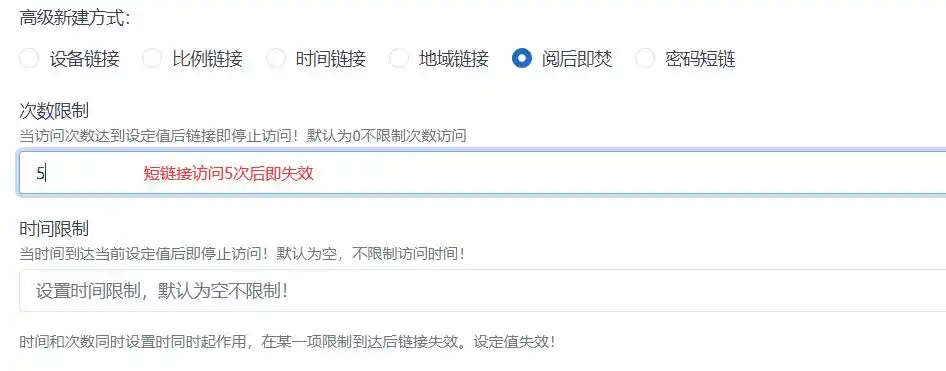 这里重点说一下小月短链接平台的“阅后即焚”的功能,在短信场景中可以实现,让每一个客户访问多少次链接后自动销毁,也可按时间,到某一时间点链接销毁,非常个性化的推广,